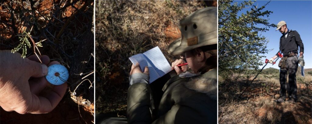The morning sun beats down, dispelling the winter chill at Tswalu. Prof Susi Vetter, her face creased with determination, pushes through a thicket of thorns to gather data. Beside her, Dr Tiffany Pillay thoroughly records every observation, a testament to the comprehensive nature of their work. Curious giraffes watch their progress with gentle eyes. Over a thousand plants are tagged across the study area, a daunting task that requires both patience and precision. Much like a treasure hunt, MSc student Jordan McCullough sweeps the ground with his metal detector, searching for the faintest signal of a buried seedling tag from previous years. Meanwhile, PhD student Bridgette McMillan carefully excavates, ensuring no trace of these botanical time capsules is missed.