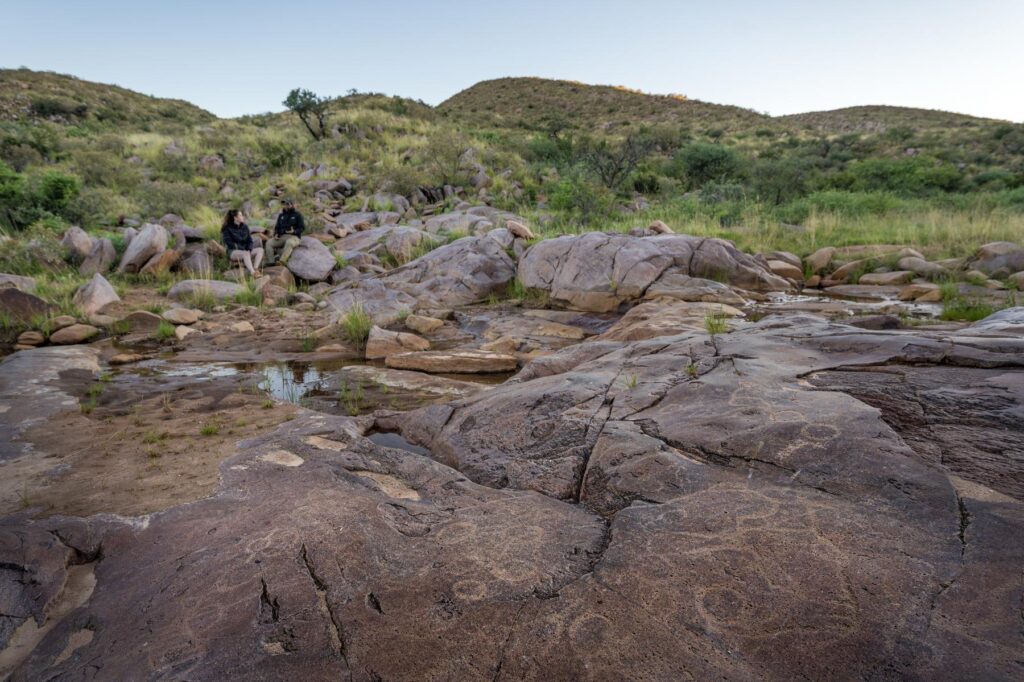 Each of Tswalu’s engraving sites carries its own character within this shared context. Klipbak is a high point in the landscape, a rich site associated with toolmaking, rainmaking and, in the engravings themselves, human figures and cupules. Cupules are depressions, resembling the shape of an inverse dome, pecked into rock surfaces by repeated percussion with a hammerstone. They are found on every continent except Antarctica, and some specimens in the southern Kalahari are suggested to be in the order of 410,000 years old. Their purpose remains largely unknown, and that uncertainty is itself significant: whatever they meant, they were not practical objects. At Klipbak, as Professor Pippa Skotnes observes, they are shapes one could imagine in one’s own flesh. The Damara word for engravings, !ā|ūisa, is a direct translation of the physical action of making them, a reminder that the body was present in this practice long before interpretation enters the picture. At Nchwaneng, dozens of engraved figures and abstract shapes mark a low hillslope with views across the landscape toward the setting sun. Water fills the depressions and hollows in the rock, and the engravings would have been felt underfoot as people approached the pools. At Steenkamp and Picnic Valley, water has smoothed the rock surfaces over centuries; when the sun is low, shadows gather in the engraved hollows and the marks become visible from a distance. The engravings have outlasted everything that made them, the hands, the people, the language, while all around them, animals continue to leave their own fleeting impressions in the mud and sand at the water’s edge.