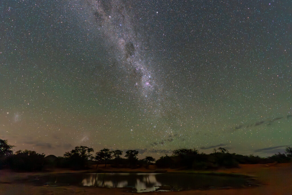 The people who made these images did not experience them as isolated objects. The scattered engravings across the Tswalu landscape would have been felt as a living whole, not pictures in frames, but a web of connected presences, circumscribing a space known through the body as much as through the eye. The rock pools between engravings reflect the stars on clear nights. The hilltops where ! giten worked are the same hilltops from which guests today watch the Kalahari sky darken and the first stars appear.